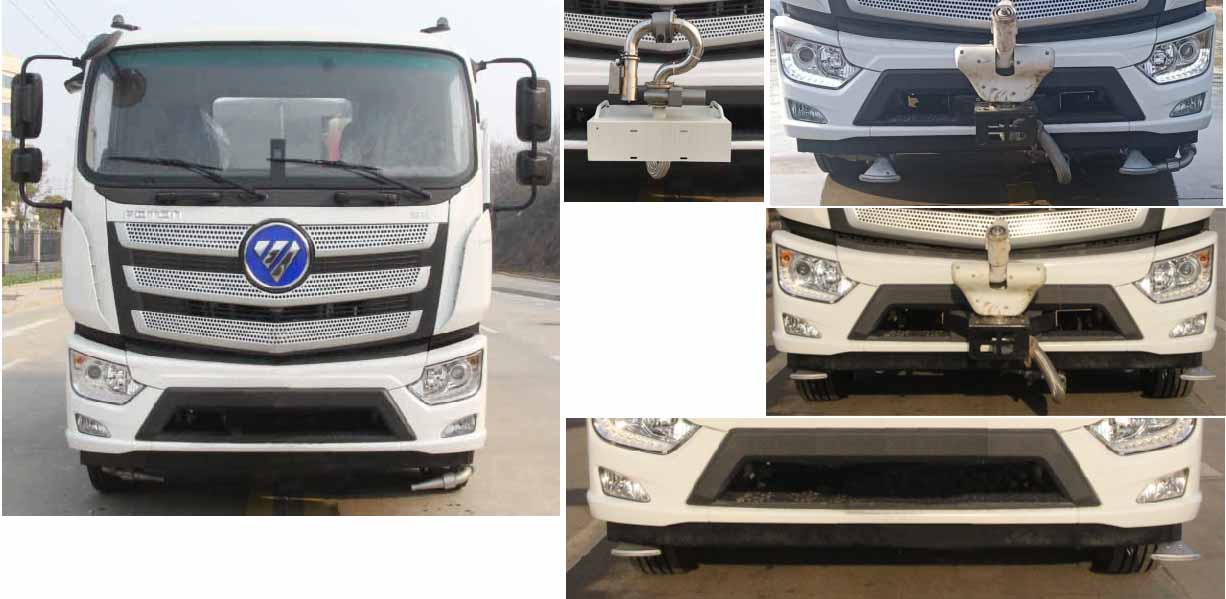 該車主要用于城鄉園林綠化,路面噴灑;主要裝置為罐體及噴灑裝置.罐體總容量:10.6立方米;罐體有效容積10.1立方米;介質:丙酮水溶液,密度950千克/立方米,罐體外形尺寸(×長軸×短軸)(mm):4600×2300×1450.側防護采用電池護罩代替,材料為Q235碳鋼,螺栓連接;后防護材料為:Q235碳鋼,連接方式為:螺栓連接,后部防護截面尺寸(mm):120×50,后部防護離地高度(mm):490;ABS型號/生產企業:ABS-E/采埃孚商用車系統(青島)有限公司;電池種類:磷酸鐵鋰電池,儲能裝置單體生產企業:寧德時代新能源科技股份有限公司,儲能裝置總成生產企業:寧德時代新能源科技股份有限公司;電機型號/生產企業:TZ375XSSF-SZF611/陜西法士特齒輪有限責任公司,額定功率:105kW,峰值功率:175kW.選裝前部電子水炮樣式,選裝前部不帶電子水炮,該狀態下車長為8100mm;當前部安裝電子水炮時,車長為8600mm,車輛前伸500mm.后部箭頭指示燈僅在車輛作業時開啟.選裝車輛前部鴨嘴裝置.