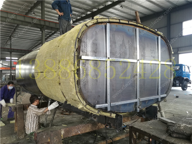 保溫熱水運輸車相比一般的灑水車在結構上多了一個保溫層,保溫層在制作上主要是在罐體外部先焊接一個支撐骨架,其厚度一般為100mm,然后再用保溫材料把骨架填充滿。在保溫材料的選擇上我們一般考慮導熱系數小,耐高溫,質量輕,吸聲性能好,絕緣性和化學穩定性好的硬質聚氨酷泡沫塑料或巖棉。然后需要對填充的保溫材料進行修正,盈通汽車后在骨架上撞上蒙板,蒙板一般使用厚度為lmm的鋁板。