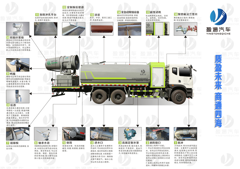 天龍23方霧炮車_東風天龍霧炮車_國六23方霧炮車_天龍23方水罐車_湖北盈通專用汽車有限公司,該車用途為抑塵降霾,主要裝置為罐體及噴霧裝置;隨底盤選裝駕駛室,選裝噴霧裝置樣式;罐體有效容積:14立方米,罐體外形尺寸(×長軸×短軸)(mm):5000×2400×1700;側、后防護材料均為:Q235碳鋼,連接方式均為:螺栓連接,后部防護截面尺寸(mm):120×50,后部防護離地高度(mm):480;ABS型號/生產廠家:3631010-C2000/東科克諾爾商用車制動系統(十堰)有限公司,ABS 8/東科克諾爾商用車制動系統(十堰)有限公司,4460046450/威伯科汽車控制系統(中國)有限公司.安裝120霧炮時,后伸930mm,對應整車長度為11580mm。隨底盤選裝底盤布置.