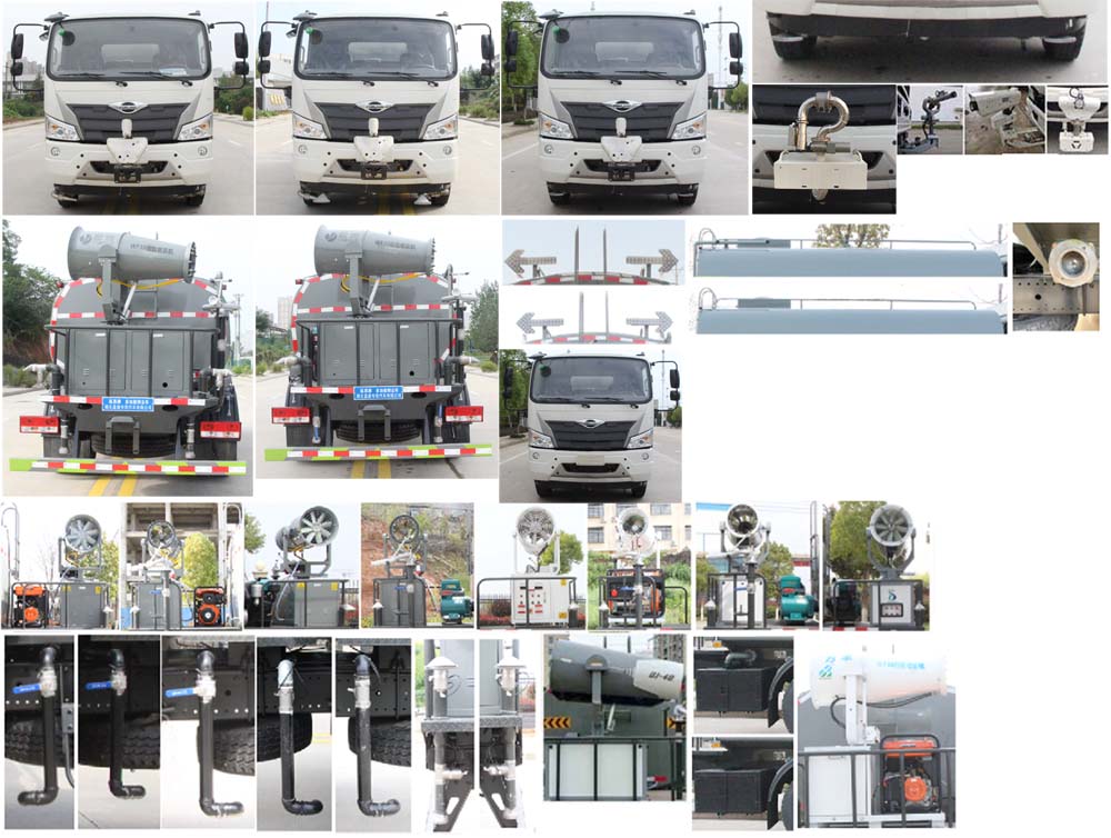 該車用途為抑塵降霾.主要裝置為罐體及噴霧裝置;罐體總?cè)萘?/span>:8.4立方米;罐體有效容積:8立方米;罐體外形尺寸(長(zhǎng)×長(zhǎng)軸×短軸)(mm):4000×2100×1400.側(cè)、后防護(hù)材料均為:Q235碳鋼,連接方式均采用螺栓連接,后部防護(hù)截面尺寸(mm):120×50,后部防護(hù)離地高度(mm):450.ABS系統(tǒng)控制器型號(hào):CM4XL-4S/4M,ABS系統(tǒng)控制器生產(chǎn)企業(yè):廣州瑞立科密汽車電子股份有限公司.選裝前部電子炮樣式,選裝前部不帶電子水炮;當(dāng)前部帶電子水炮時(shí),車長(zhǎng)為7950mm,前伸為500mm;當(dāng)前部不帶電子水炮時(shí),車長(zhǎng)為7450mm,前伸為0mm.選裝噴霧裝置樣式,選裝罐體頂部高位花灑裝置,選裝大工作平臺(tái),選裝車輛前部鴨嘴裝置,選裝自動(dòng)球閥安裝位置,選裝箭頭燈裝置,選裝罐體頂部方形罐口及罐口位置,選裝尾部自流口裝置,后部作業(yè)燈僅在作業(yè)時(shí)開啟,車輛行駛過程中不可開啟.