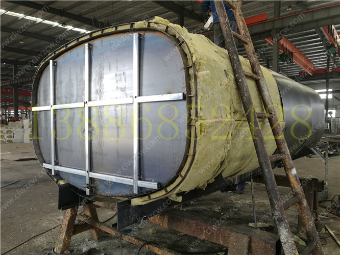 3. 保層溫的制作是在水罐外部另外焊接10mm厚的支撐骨架,然后用保溫材料將骨架內(nèi)部填充滿,最后在骨架外蒙上一層外皮。 保溫層外表鐵皮采用8mm厚高強(qiáng)度耐磨板,可選擇使用不銹鋼分鏡面8K或磨砂板