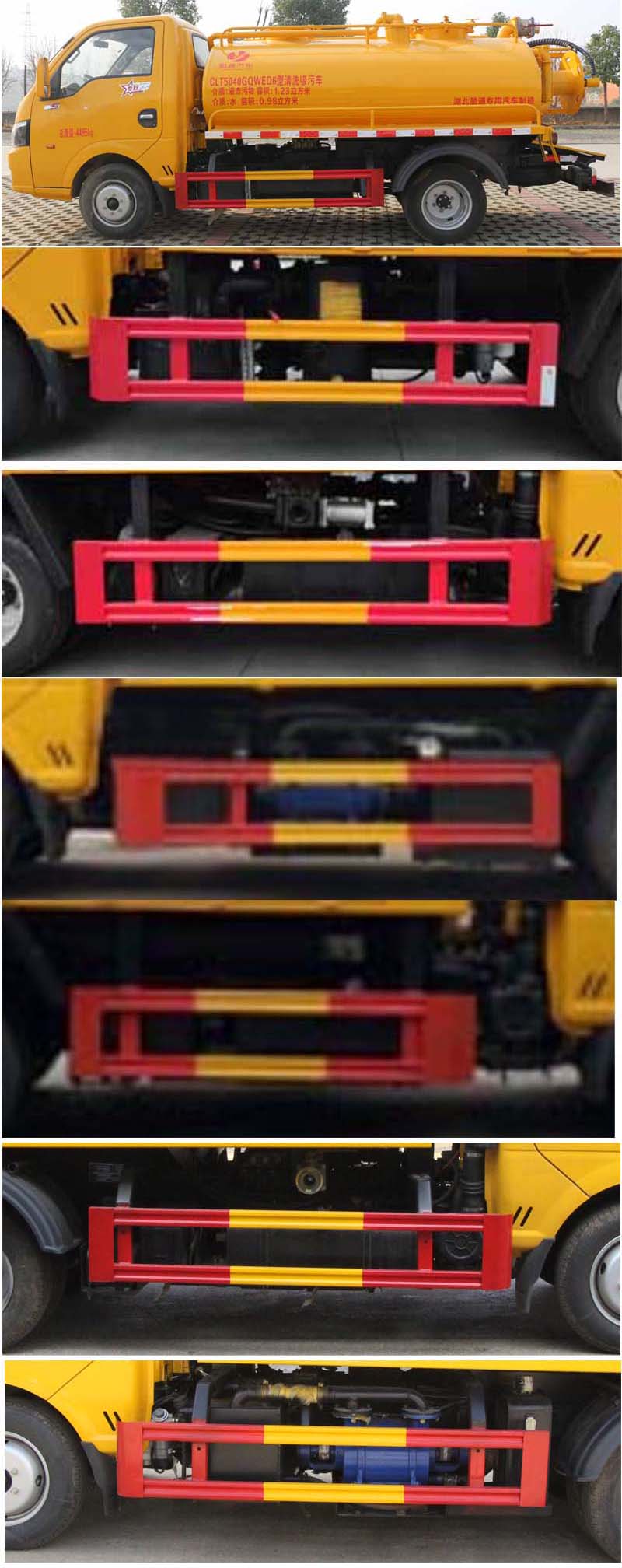 該車用于下水道排污及疏通,專用裝置:罐體及清洗吸污裝置;罐體外形尺寸(×長軸×短軸)(mm):2800×1550×1000,罐體前段為清水罐(1590mm,其中前端下部1100mm用于安裝高壓泵);后段為污水罐(1210mm);污水罐總容量:1.29立方米,污水罐有效容積:1.23立方米,介質:液態污物,密度800千克/立方米;清水罐總容量:1.03立方米,清水罐有效容積:0.98立方米,介質:,密度1000千克/立方米,清水罐和污水罐為獨立罐體,清洗功能時用清水罐,吸污功能時用污水罐,污水罐和清水罐不可同時滿載,兩罐不能同時滿載使用;ABS型號/廠家:APG3550500A/浙江亞太機電股份有限公司;側、后防護材料均為:Q235碳鋼,連接方式均為:螺栓連接,后部防護截面尺寸(mm):100×50,后部防護離地高度(mm):360.僅采用底盤2800mm軸距改裝.選裝油箱及電瓶位置。隨底盤選裝駕駛室。
